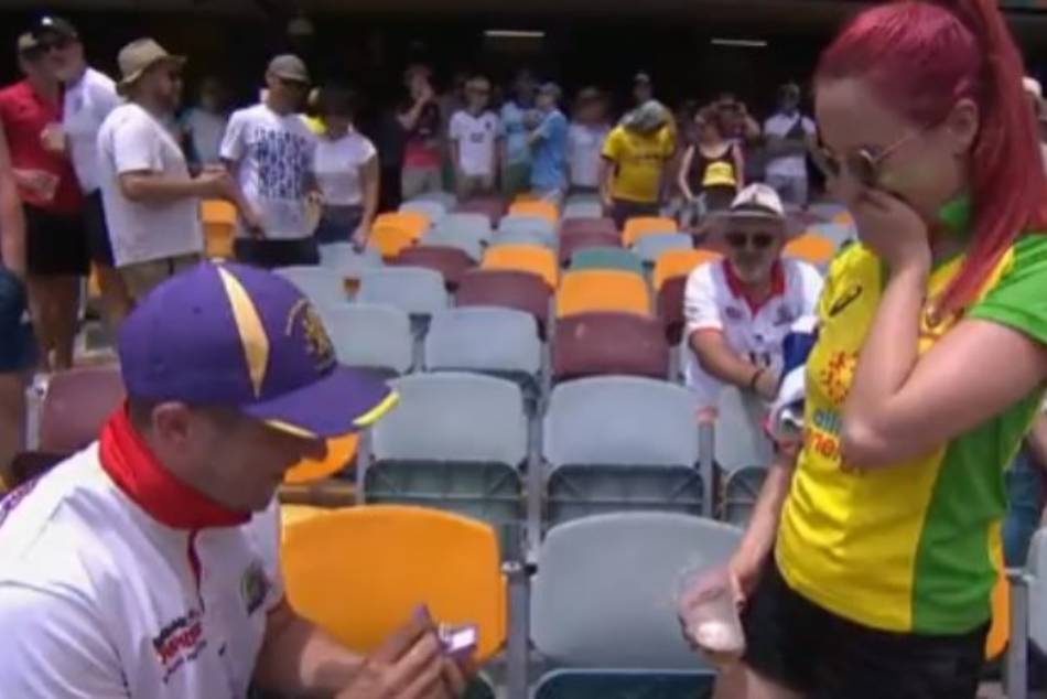 అసలేం జరిగిందంటే.. మూడో రోజు ఆటలో భాగంగా... ఫ్యాన్స్ అంతా మ్యాచ్ వీక్షిస్తుండగా.. ఇంగ్లండ్కు చెందిన రాబ్ అనే వ్యక్తి మాత్రం తన పనిలో తాను తలమునకలైపోయాడు. ఆస్ట్రేలియాకు చెందిన ప్రేయసి నాట్ ముందు మోకాళ్లపై కూర్చుని ఉంగరం తీసి ఆమెకు ప్రపోజ్ చేశాడు. 'గత నాలుగేళ్లుగా నీ కోసం ఎదురు చూస్తున్నాను. నన్ను పెళ్లి చేసుకుంటావా?' అని అడిగాడు. ఊహించని ఈ పరిణామానికి మొదట కొంత అయోమయానికి గురైన నాట్.. తర్వాత అతడి ప్రపోజల్కు ఒప్పుకొంది. రాబ్ను ఆత్మీయ ఆలింగనం చేసుకుని ముద్దుల్లో ముంచెత్తింది .