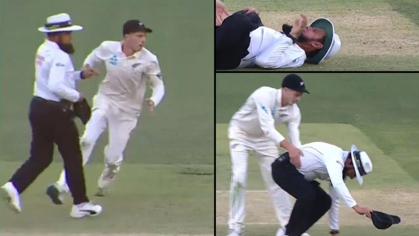 బంతిని బ్యాకప్ చేస్తున్న శాంట్నర్.. బంతి నుంచి తప్పించుకునే ప్రయత్నం చేసిన అలీమ్ దార్ ఒకరిపైఒకరు ఢీ కొట్టకున్నారు. అయితే సాంట్నర్ అలీమ్ను తప్పించుకునే ప్రయత్నం చేసినప్పటికీ కుదర్లేదు. దీంతో అలీమ్ మోకాలికి గాయమైంది. నొప్పిని తట్టుకోలేక అలీమ్ మైదానంలోనే కుప్పకూలాడు. వెంటనే న్యూజిలాండ్ ఫిజియో వచ్చి అతడికి చికిత్స చేశాడు. అనంతరం అలీమ్ తన విధులను కొనసాగించాడు. తొలి టెస్టులో కివీస్పై ఆసీస్ ఆధిపత్యం చెలాయిస్తోంది.