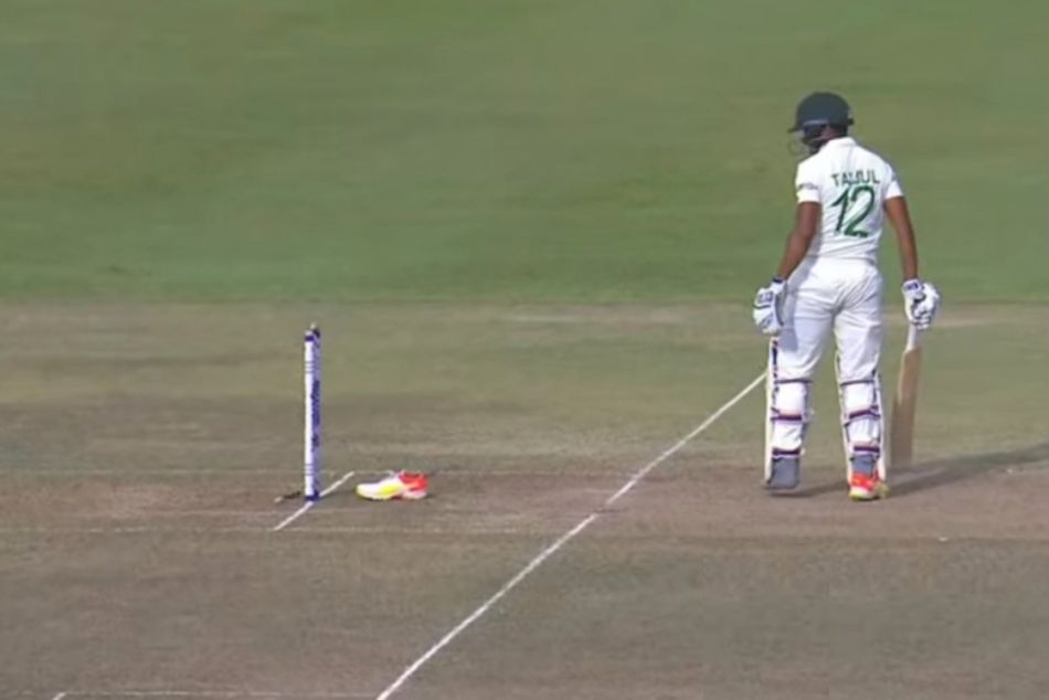 తైజుల్ ఇస్లాం షాట్ ఆడిన అనంతరం సింగల్ కోసం ప్రయత్నించాడు. అయితే లంక ఆటగాళ్లు హిట్ వికెట్ అవ్వడంతో బంతి కోసం వెళ్ళలేదు. ఇది చూసిన ఇస్లాం హిట్ వికెట్ అయ్యానని గ్రహించి షూ వేసుకుని పెవిలియన్ చేరాడు. ఇస్లాం 50 బంతుల్లో 9 పరుగులు చేసి ఔట్ అయ్యాడు. దీనికి సంబందించిన వీడియో నెట్టింట వైరల్ అయింది. వీడియో చూసిన ఫాన్స్ నవ్వులతో పాటు కామెంట్ల వర్షం కురిపిస్తున్నారు. 'దురదృష్టకరమైన ఔట్' అని ఒకరు కామెంట్ చేయగా.. 'ఇలా ఔట్ అవ్వడం క్రికెట్ చరిత్రలో ఇదే మొదటిసారి' అని ఇంకొకరు అన్నారు.