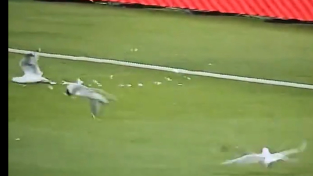 బంతి అమాంతం గాల్లోకి లేసి బౌండరీ లైన్ తాకింది. కానీ అదే సమయంలో బౌండరీ లైన్ వద్ద సీ గల్ జాతికి చెందిన పావురాలు ఉన్నాయి. బంతి దెబ్బకి అన్నీ గాల్లోకి ఎగరగా ఓ పావురానికి మాత్రం బంతి బలంగా తాకింది. దీంతో సీ గల్ అక్కడికక్కడే రెక్కలు ఊడిపోయి కుప్పకూలిపోయింది. కాసేపు కిందపడి విలవిలలాడింది. సెక్యూరిటీ సిబ్బంది వచ్చి దాన్ని వెంటనే బయటకు తీసుకెళ్లారు. కానీ అంతలోనే అది చనిపోయినట్లు తెలిసింది.