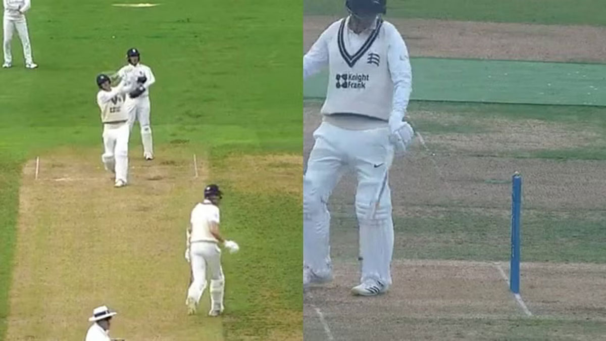 కౌంటీ ఛాంపియన్షిప్ 2023 డివిజన్ వన్ పోటీల్లో భాగంగా మంగళవారం(జూలై 25) వార్విక్షైర్తో జరిగిన మ్యాచ్లో మిడిల్ సెక్స్ కెప్టెన్ టోబీ రోలాండ్ జోన్స్ విచిత్రకర పరిస్థితుల్లో హిట్ వికెటయ్యాడు. ఎడ్ బెర్నార్డ్ బౌలింగ్లో బారీ సిక్సర్ బాదిన టోబీ రోలాండ్.. అదే బంతికి హిట్ వికెట్గా వెనుదిరిగాడు. భారీ సిక్సర్ బాదిన అతను అదే ఆనందంలో వెనక్కి జరుగుతూ బ్యాట్ను స్వింగ్ చేశాడు.