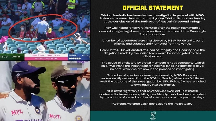 'ఇలాంటి వివక్షాపూరిత ప్రవర్తనను క్రికెట్ ఆస్ట్రేలియా ఖండిస్తోంది. దీనిపై ఐసీసీ విచారణ ఫలితం కోసం ఎదురు చూస్తోంది. బాధ్యులను గుర్తించిన తర్వాత వేధింపుల నిరోధక కోడ్ ప్రకారం వారిపై కఠిన చర్యలు తీసుకుంటాం. దీర్ఘకాలం నిషేధం, మరిన్ని ఆంక్షలు, న్యూసౌత్వేల్స్ పోలీసులకు ఫిర్యాదు చేయడం లాంటివి చేస్తాం. సిరీస్కు ఆతిథ్యమిస్తున్న వ్యక్తులుగా మేము మా ఇండియన్ క్రికెట్ స్నేహితులకు క్షమాపణ కోరుతున్నాం' అని క్రికెట్ ఆస్ట్రేలియా స్పష్టం చేసింది.