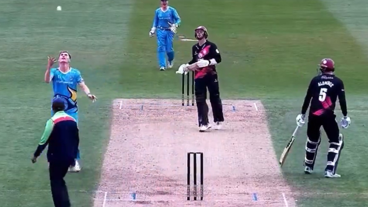 అనంతరం ఛేదనలో యార్క్షైర్ 16.5 ఓవర్లలో 125 పరుగులకు ఆలౌటైంది. వగాడియా (27; 15 బంతుల్లో, 5 ఫోర్లు) టాప్ స్కోరర్. లియోనార్డ్ నాలుగు వికెట్లతో చెలరేగాడు. అయితే సోమర్సెట్, ఇన్నింగ్స్లో ఆసక్తికర సంఘటన చోటు చేసుకుంది. రెండు బంతులు ఎదుర్కొని వికెట్ చేజార్చుకున్న లియోనార్డ్ భిన్నమైన రీతిలో పెవిలియన్కు చేరాడు.