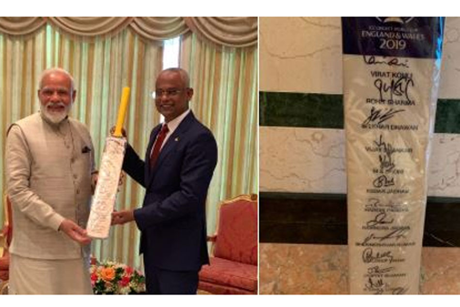 రెండవసారి ప్రధాని పగ్గాలు చేపట్టిన తర్వాత రెండు రోజుల విదేశీ పర్యటనలో భాగంగా ప్రధానమంత్రి నరేంద్ర మోడీ శనివారం మాల్దీవులకు చేరుకున్నారు. ఈ పర్యటనలో భాగంగా ఆ దేశాధ్యక్షుడు ఇబ్రహీం మొహమ్మద్ సోలిహ్కు టీమిండియా కెప్టెన్ విరాట్ కోహ్లీతో పాటు జట్టులోని మిగతా క్రికెటర్లు సంతకాలు చేసిన బ్యాట్ని బహుకరించాడు.