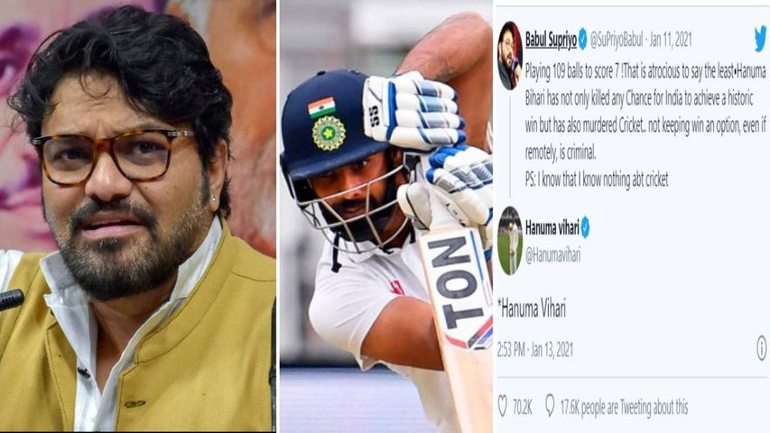 '7 పరుగులు చేయడానికి 109 బంతులాడాడు. ఈ విషయం చెప్పడం కూడా నాకు ఇబ్బందిగా ఉంది. మ్యాచ్లో హనుమ బిహారి.. టీమిండియా చారిత్రక విజయం సాధించే అవకాశాన్ని చంపేయడమే కాకుండా క్రికెట్ని కూడా హత్య చేశాడు. విజయం కోసం ప్రయత్నించకపోవడం నేరమే అవుతుంది' అని బీజేపీ ఎంపీ బాబుల్ సుప్రియో ట్వీట్ చేశారు. చివరలో తనకి క్రికెట్ గురించి ఏమీ తెలియదని కూడా ఒప్పుకున్నారు. అయితే అందులో హనుమ విహారి పేరును తనకు అలవాటైన నార్త్ ఇండియన్ స్టైల్లో హనుమ బిహారి అని రాశారు.