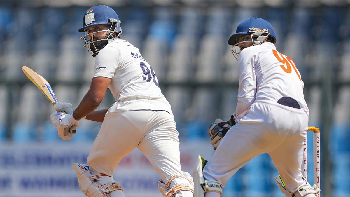 అయితే శ్రేయస్ అయ్యర్ (95; 111 బంతుల్లో, 10×4, 3×6) తృటిలో సెంచరీ కోల్పోయాడు. సిక్సర్తో శతకం సాధించాలనుకున్న అతడికి నిరాశే మిగిలింది. ఆదిత్య ఠాక్రే ఆఫ్ స్టంప్ వైపుకు వేసిన బంతిని శ్రేయస్ భారీ షాట్కు యత్నించాడు. కానీ దురదృష్టవశాత్తు ఆ సమయానికి శ్రేయస్ బ్యాట్ గ్రిప్ చేజారింది. దీంతో నియంత్రణతో షాట్ ఆడలేకపోయాడు. ఆ తర్వాత తన చేతుల్లో నుంచి బ్యాటు కూడా కిందపడిపోయింది. మరోవైపు లాంగాన్లో ఉన్న అమన్ క్యాచ్ను అందుకున్నాడు.
