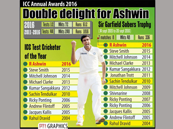 కాగా, ఈ ఏడాదిలో ఇప్పటి వరకు 8 టెస్టులాడిన అశ్విన్ 8 టెస్టుల్లో 48 వికెట్లు పడగొట్టడంతోపాటు 336 పరుగులు సాధించాడు. 19 టీ20ల్లో 27 వికెట్లు తీసుకున్నాడు. అంతేగాక టెస్టుల్లో నెంబర్ వన్ బౌలర్గా 2015ను ముగించిన అశ్విన్, 2016లో కూడా నెంబర్ వన్ ర్యాంక్ని కైవసం చేసుకున్నాడు.