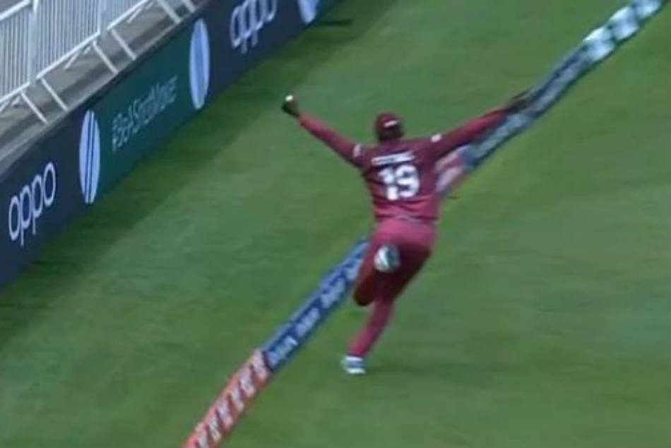 అయితే, అదే సమయంలో బౌండరీ వద్ద ఫీల్డింగ్ చేస్తోన్న షెల్డన్ కాట్రెల్ పరుగెత్తుకు వచ్చి ఎడమ చేత్తో దానిని ఒడిసిపట్టేశాడు. అయితే, బౌండరీకి అతి సమీపంలో ఉండటంతో చురుగ్గా స్పందించి బంతిని గాల్లోకి విసిరేశాడు. బౌండరీ వెలుపలికి వెళ్లి, తిరిగి మైదానంలోకి వచ్చి బంతిని అందుకున్నాడు.