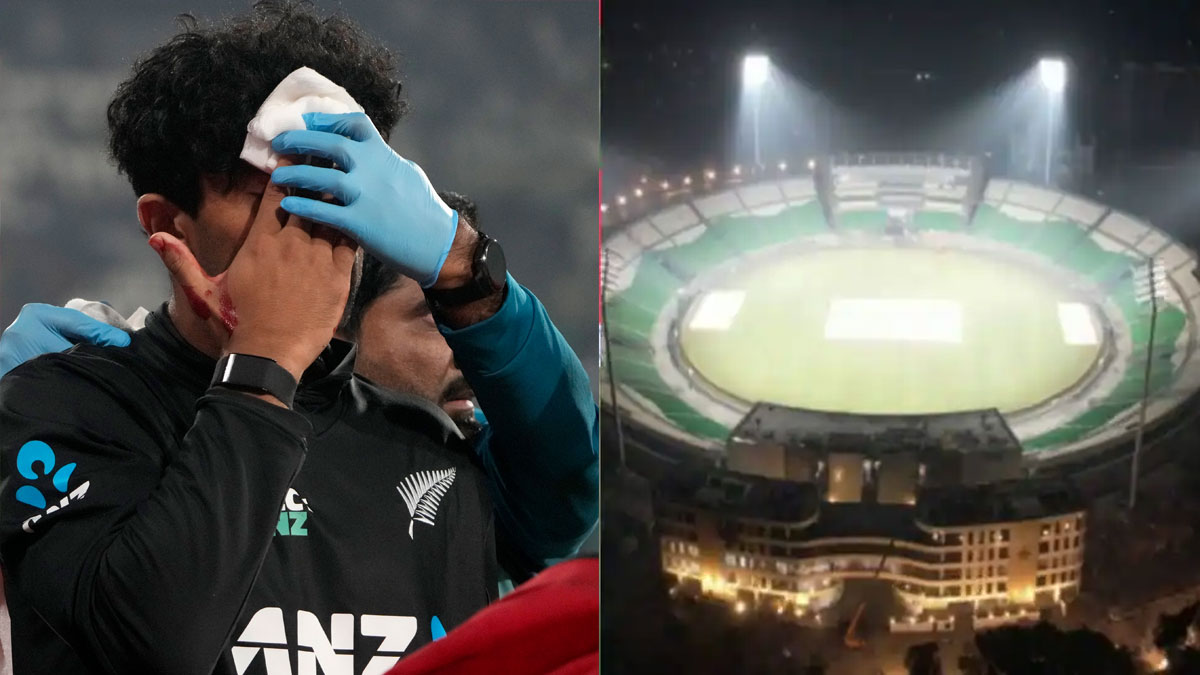 రచిన్ బౌండరీ లైన్ దగ్గర క్యాచ్ కు ప్రయత్నించి గాయపడ్డాడు. బంతి గమనాన్ని సరిగ్గా అంచనా వేయలేకపోవడం ఈ గాయమైంది. బంతి అతడి నుదుటికి నేరుగా తాకింది. అయితే దీనికి కారణం ఫ్లడ్లైట్ల వెలుతురు సరిగ్గా లేకపోవడమే అని అంటున్నారు. పైగా ఈ మ్యాచ్ లాహోర్లోని గడాఫీ స్టేడియం వేదికగా జరిగింది.