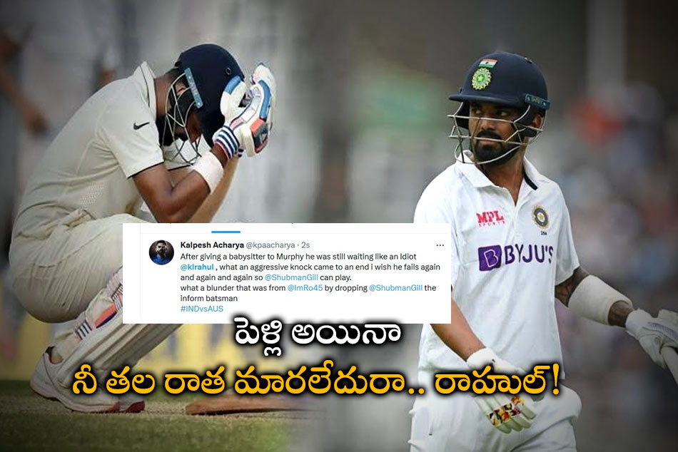 ఈ సిరీస్కు ముందే తన గర్ల్ఫ్రెండ్ అతియా శెట్టిని పెళ్లి చేసుకున్న రాహుల్.. కనీసం హనీ మూన్కు కూడా వెళ్లకుండా టీమిండియాతో చేరాడు. పెళ్లి అయిన రెండు రోజులకే బోర్డర్ గవాస్కర్ ట్రోఫీ కోసం బ్యాట్ పట్టాడు. పెళ్లి అయినా.. రాహుల్ రాత మారలేదని, వెంటనే అతన్ని జట్టులో నుంచి తీసేయాలని ఫ్యాన్స్ కోరుతున్నారు. దేశవాళీ క్రికెట్ ఆడి మళ్లీ లయ అందుకున్న తర్వాతనే జట్టులోకి తీసుకోవాలని సెలెక్టర్లకు సూచిస్తున్నారు. హర్భజన్ సింగ్, రవిశాస్త్రి వంటి ఆటగాళ్లు శుభ్మన్ గిల్నే ఓపెనర్గా ఆడించాలని సూచించినా.. టీమ్మేనేజ్మెంట్ పట్టించుకోకపోవడం ఏంటో అర్థం కావడం లేదంటున్నారు.