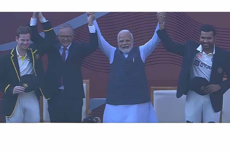 అనంతరం ఇద్దరు ప్రధానులు తమ కెప్టెన్లకు టెస్ట్ క్యాప్ అందజేశారు. ప్రధాని మోదీ భారత కెప్టెన్ రోహిత్ శర్మకు టెస్ట్ క్యాప్ ఇవ్వగా.. స్మిత్కు ఆల్బనీస్ అందజేశాడు. వెంటనే మోదీ స్మిత్కు షేక్ హ్యాండ్ ఇచ్చి.. ఆసీస్ ప్రధానితో పాటు రోహిత్ శర్మ చేతులను పైకెత్తి తమ స్నేహం ఇలానే కొనసాగాలని చాటిచెప్పాడు. దీనికి సంబంధించిన వీడియో నెట్టింట వైరల్గా మారింది. మ్యాచ్ ప్రారంభానికి ముందు ఇరు దేశాల ప్రధానులు బంగారు పూత పూసిన గోల్ఫ్ కారులో స్టేడియం మొత్తం తిరిగి అభిమానులకు అభివాదం చేశారు.