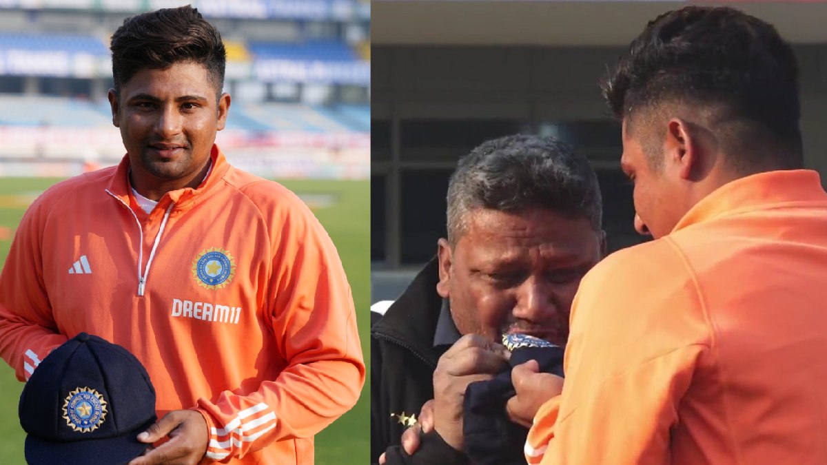 ఈ క్షణంలో మైదానంలోనే ఉన్న సర్ఫరాజ్ ఫ్యామిలీ భావోద్వేగానికి గురయ్యారు. క్యాప్ను అందుకున్న అనంతరం సర్ఫరాజ్ తన ఫ్యామిలీ దగ్గరకు వెళ్లాడు. తన తండ్రి నౌషద్ ఖాన్, తన భార్య రోమన జహూర్ను కలుసుకుని కల నెరవేరిందంటూ తన క్యాప్ను చూపించాడు. ఆ క్షణంలో వాళ్లంతా కన్నీటినీ ఆపుకోలేకపోయారు. తన తండ్రి నౌషద్ ఖాన్.. సర్ఫరాజ్ను కౌగిలించుకుని ఎమోషనల్ అయ్యాడు.