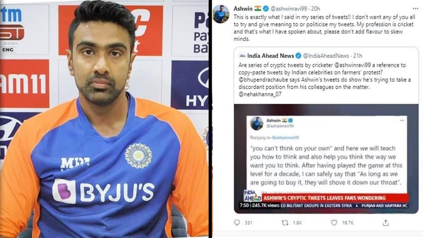 అయితే ఓ మీడియా ఛానల్ రవిచంద్రన్ అశ్విన్ వరుస ట్వీట్లపై ఓ కథనం ప్రసారం చేసింది. యాష్ చేసిన ట్వీట్లు రైతు ఉద్యమం నేపథ్యంలో ఉన్నాయని అర్థం వచ్చేలా ప్రసారం చేసింది. ఆ కథనానికి సంబంధించిన వీడియోను తాజాగా పంచుకొని అశ్విన్ ధీటుగా బదులిచ్చాడు. 'వరుస ట్వీట్లలో నేను చెప్పింది ఇదే. నా ట్వీట్లకు రాజకీయ దురుద్దేశాలు అంటించవద్దని మీ అందర్నీ కోరుతున్నా. నా వృత్తి క్రికెట్ ఆడటం. నేను దాని గురించే మాట్లాడాను. ప్రజలను తప్పుదోవ పట్టించడానికి కల్పితాలు జోడించకండి' అని అశ్విన్ రాసుకొచ్చాడు.
