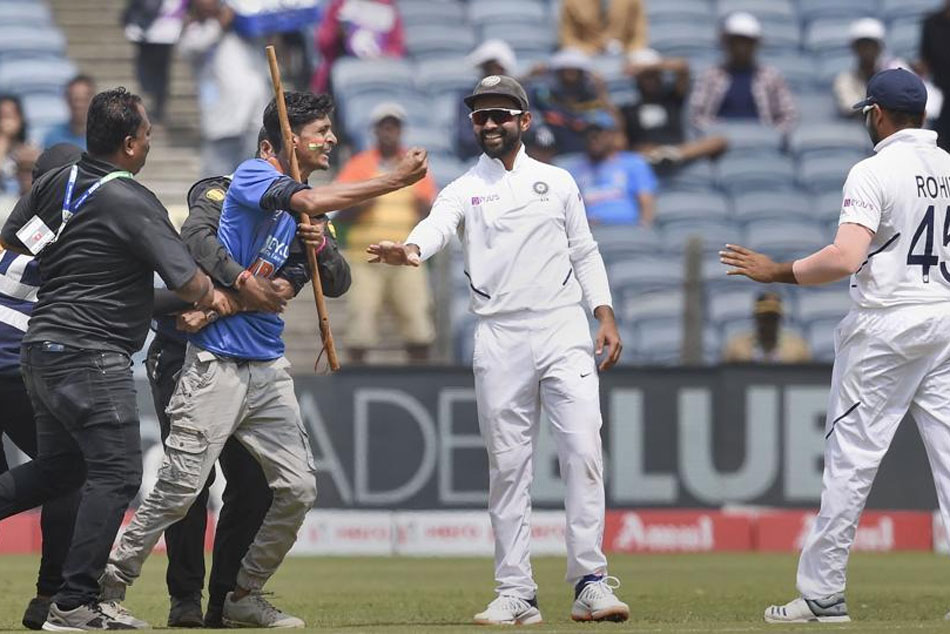 అభిమాని మైదానంలో ఫీల్డింగ్ చేస్తున్న రోహిత్ వద్దకు పరిగెత్తుకు వచ్చి అతడి పాదాలను ముద్దాడేందుకు ప్రయత్నించాడు. పక్కనే ఉన్న రహానే వద్దు అని సూచించినా.. అభిమాని మాత్రం ఆగలేదు. అయితే ఈ ప్రయత్నంలో అదుపు తప్పిన రోహిత్ కిందపడ్డాడు. దీంతో భద్రతా సిబ్బంది వెంటనే పరిగెత్తుకొచ్చి అతడిని దూరంగా తీసుకెళ్లారు. ఇది చూసిన రహానే నవ్వుకున్నాడు.