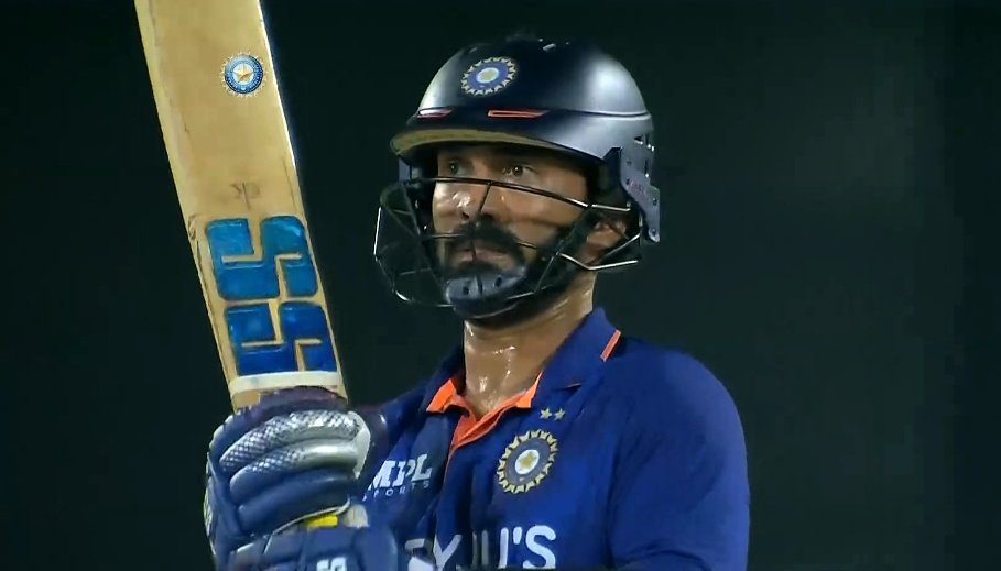 15వ ఓవర్లో దినేష్ కార్తీక్ ఫోర్ కొట్టి తన హిట్టింగ్ మొదలెట్టాడు. హార్దిక్ పాండ్యాతో కలిసి దినేష్ కార్తీక్ 65పరుగుల భాగస్వామ్యం నమోదు చేశాడు. నార్జ్ వేసిన 16వ ఓవర్లో దినేష్ కార్తీక్ రెండు ఫోర్లు, 17వ ఓవర్లో కేశవ్ మహారాజ్ బౌలింగ్లో మూడు ఫోర్లు, 18వ ఓవర్ ప్రిటోరియస్ వేయగా. ఆ ఓవర్లో 6, 4, 4 కొట్టి దినేష్ కార్తీక్ తన పవరేంటో చూపించాడు. ఆ ఓవర్లో 16పరుగులొచ్చాయి. 19వ ఓవర్లో ఒక ఫోర్ కొట్టిన దినేష్.. చివరి ఓవర్లో సిక్స్ కొట్టి టీ20లో తన తొలి హాఫ్ సెంచరీ పూర్తి చేసుకున్నాడు. 2బంతికి హిట్ చేసినప్పటికీ వాన్ డర్ డుస్సెన్ పట్టిన క్యాచ్తో పెవిలియన్ బాట పట్టాడు. దినేష్ కార్తీక్ దూకుడుకు చివరి అయిదు ఓవర్లలో 73పరుగులొచ్చాయి. దీంతో 140అనుకున్న స్కోరు 169పరుగులు చేరుకుంది. తద్వారా టీమిండియా 170పరుగుల లక్ష్యాన్ని ప్రోటీస్ ముందుంచింది. ఇక బౌలింగ్లో అవేశ్ ఖాన్ 4/18తో చెలరగేడంతో దక్షిణాఫ్రికా 87పరుగులకు చాపచుట్టేసింది. తద్వారా ఇండియా 82పరుగులతో గెలుపొందింది.