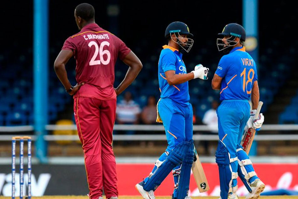 ఈ సమయంలో క్రీజులోకి వచ్చిన యువ ఆటగాడు శ్రేయాస్ అయ్యర్ కెప్టెన్ కోహ్లీకి జత కలిసాడు. ఆదిలో ఆచితూచి ఆడిన ఈ జోడి అనంతరం జోరు సాగించారు. కోహ్లీ బౌండరీలు బాడుతుంటే.. శ్రేయస్ చెత్త బంతులను సిక్సర్లు బాదుతూ స్కోర్ వేగాన్ని పెంచాడు. ఈ క్రమంలో 26వ ఓవర్లో అర్ధ శతకం (65; 41బంతుల్లో 3×4, 5×6) పూర్తి చేసుకున్నాడు. ధాటిగా ఆడే ప్రయత్నంలో రోచ్ బౌలింగ్లో హోల్డర్ చేతికి చిక్కాడు. దీంతో 120 పరుగుల భాగస్వామ్యానికి తెరపడింది.