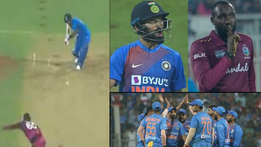 హైదరాబాద్ టీ20లో తన చేతిని వర్చువల్ 'నోట్బుక్'గా మార్చి టిక్ కొడుతున్నట్లు విన్యాసం చేసి హల్చల్ చేసిన కోహ్లీ మరోసారి అలాంటి ఘటననే పునరావృతం చేసాడు. విండీస్ బౌలర్ కెస్రిక్ విలియమ్స్ వేసిన 18 ఓవర్ నాలుగో బంతిని కోహ్లీ మిడ్ వికెట్ మీదుగా సిక్స్ కొట్టాడు. అది భారీ సిక్సర్గా వెళ్లడంతో.. కోహ్లీ తన కళ్లను పెద్దవిగా చేసి సంబరాలు చేసుకున్నాడు. అంతేకాదు బౌలర్ వద్దకు వెళ్లి తన నోటికి పనిచెప్పాడు.