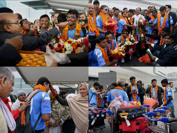 అంధుల క్రికెట్ ప్రపంచకప్ను గెలుచుకొని ప్రత్యేక విమానంలో డిల్లీలోని ఇందిరా గాంధీ అంతర్జాతీయ విమానాశ్రయంకు చేరుకున్న ఇండియా టీమ్కు స్వాగతం పలికిన దృశ్యం.