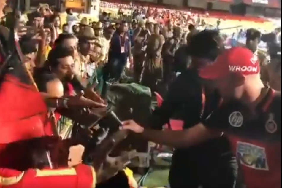 కాగా, మ్యాచ్ ముగిసిన అనంతరం ఏబీ డివిలియర్స్ సొంత మైదానంలో మద్దతు తెలిపిన అభిమానులకు కృతజ్ఞతలు తెలిపాడు. స్టాండ్స్లోని ప్రేక్షకుల వద్దకు వెళ్లి షేక్ హ్యాండ్ ఇవ్వడంతో పాటు, ఓ లక్కీ ఫ్యాన్కు సావనీర్ అందజేశాడు. దీంతో ఆ అభిమాని ఆనందానికి అవధుల్లేకుండా పోయాయి. ఇందుకు సంబంధించిన వీడియోని రాయల్ ఛాలెంజర్స్ బెంగళూరు తన అధికారిక ట్విట్టర్లో అభిమానులతో పంచుకుంది.