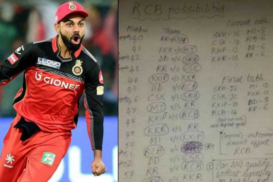 ఏమో! కొంచెం అదృష్టం కలిసొస్తే రాయల్ ఛాలెంజర్స్ బెంగళూరుకు ఫ్లే ఆఫ్స్ అవకాశం లభించవచ్చని అభిమానులు అభిప్రాయపడుతున్నారు. ఈ లెక్కకు సంబంధించి పేపర్పై రాసి ఉన్న ఇమేజిని శ్రీహరి రామన్ అనే నెటిజన్ ట్విట్టర్లో పోస్టు చేశాడు. అది మీకోసం ....