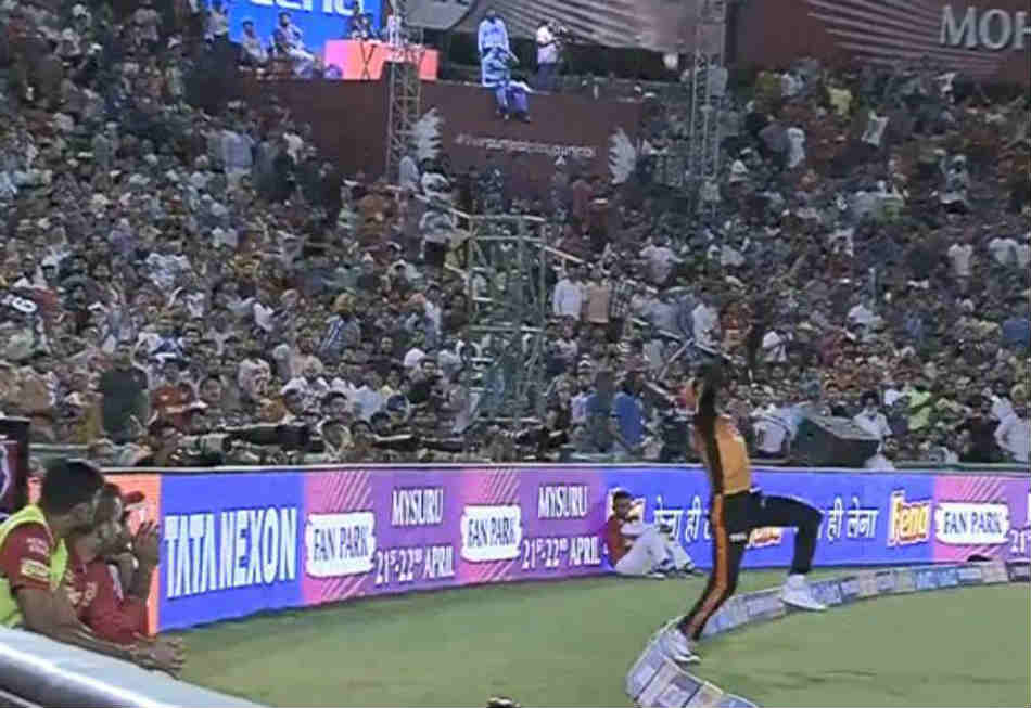ఈ క్రమంలో పంజాబ్ ఇన్నింగ్స్లో భాగంగా హైదరాబాద్ స్సిన్నర్ షకిబ్ ఉల్ హసన్ 12 ఓవర్ను వేశాడు. తొలి బంతికి పంజాబ్ ఆటగాడు కరుణ్ నాయర్ లాంగాఫ్ మీదుగా భారీ షాట్ ఆడాడు. అదే సమయంలో అక్కడ ఫీల్డింగ్ చేస్తున్న మనీష్ పాండే బంతిని అందుకునే ప్రయత్నం చేశాడు.
