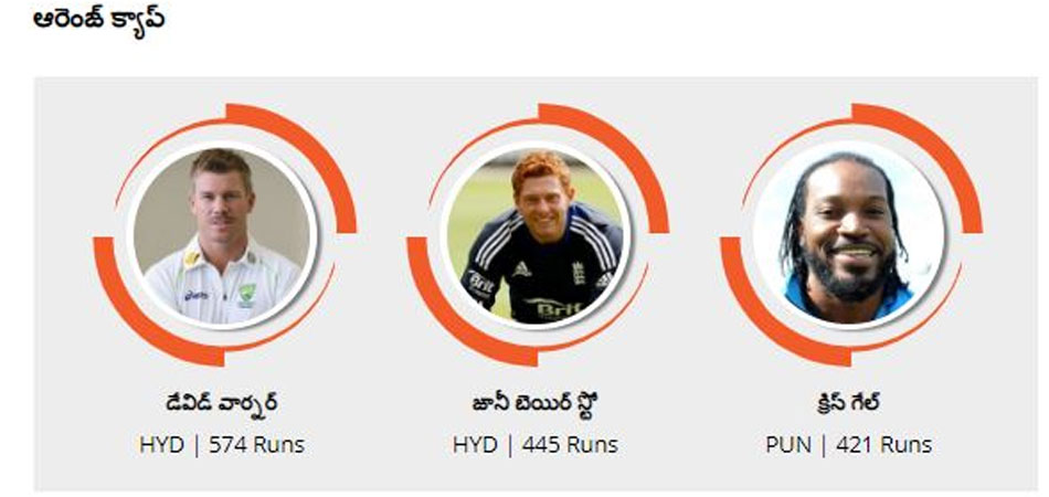 సన్రైజర్స్ హైదరాబాద్ ఓపెనర్లు డేవిడ్ వార్నర్, జానీ బెయిర్ స్టోలు ఆరెంజ్ క్యాప్ రేసులోనే ఉన్నారు. టోర్నీలో ఇప్పటివరకు 10 మ్యాచ్లాడిన డేవిడ్ వార్నర్ 574 పరుగులతో ఈ జాబితాలో అగ్రస్థానంలో ఉండగా... జానీ బెయిర్ స్టో 445 పరుగులతో రెండో స్థానంలో కొనసాగుతున్నాడు.