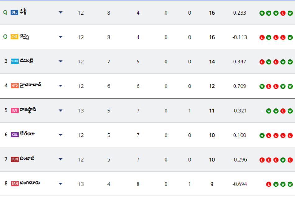 ఈ సీజన్లో ఢిల్లీ క్యాపిటల్స్, చెన్నై సూపర్ కింగ్స్ జట్లు ఇప్పటికే ప్లేఆఫ్ బెర్తులను ఖాయం చేసుకున్నాయి. ఈ రెండు జట్లు చేయాల్సిందల్లా ఒకటే మిగతా రెండు లీగ్ మ్యాచ్ల్లో గెలిచి తమ అగ్ర స్థానాలను పదిలం చేసుకోవడమే. చిన్నస్వామి స్టేడియంలో ఆర్సీబీతో జరిగిన మ్యాచ్ వర్షం కారణంగా రద్దు కావడం రాజస్థాన్ అవకాశాలను దెబ్బతీసింది. ఈ మ్యాచ్లో రాజస్థాన్ గెలిచి, మిగతా మ్యాచ్ల ఫలితాలు కలిసొస్తే ముందంజ వేయడానికి అవకాశముండేది. రాజస్థాన్ మిగిలిన ఒక మ్యాచ్లలో గెలిచినా 13 పాయింట్లు అవుతాయి. 13 పాయింట్లతో ప్లేఆఫ్ చేరడం అసాధ్యం.