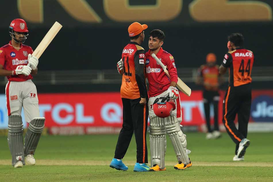 పంజాబ్ లక్ష్య ఛేదనను పేలవంగా ఆరంభించింది. రెండో ఓవర్లో అనవసర పరుగుకు ప్రయత్నించి మయాంక్ అగర్వాల్ (9) రనౌట్ అయ్యాడు. 4.2వ బంతికి సిమ్రన్ సింగ్ (11) క్యాచ్ను ప్రియమ్ గార్గ్ అద్భుతంగా పట్టాడు. మరికాసేపటికే కేఎల్ రాహుల్ (11; 16 బంతుల్లో) ఔట్ అయ్యాడు. యువ స్పిన్నర్ అభిషేక్ శర్మ బౌలింగ్లో రాహుల్ భారీ సిక్సర్కు ప్రయత్నించి ఔటవడంతో పంజాబ్పై ఒత్తిడి పెరిగింది. 58/3తో కష్టాల్లో ఉన్న జట్టును నికోలస్ పూరన్ ఆదుకున్నాడు.