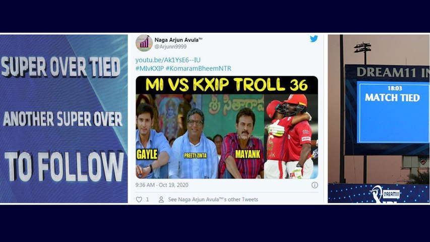 నిర్ణీత ఓవర్లలో పంజాబ్, ముంబై జట్లు సమాన స్కోర్లు చేయగా.. ఫలితం తేలేందుకు నిర్వహించిన సూపర్ ఓవర్ కూడా టై అయింది. మొదట బ్యాటింగ్ చేసిన పంజాబ్ జస్ప్రీత్ బుమ్రా ధాటికి కేవలం 5 పరుగులే చేయగలిగితే.. ఆ తర్వాత మొహమ్మద్ షమీ ధాటికి ముంబై కూడా సరిగ్గా అవే పరుగులు చేసింది. మరో సూపర్ ఓవర్ నిర్వహించగా.. ఈ సారి మొదట బ్యాటింగ్ చేసిన ముంబై కీరన్ పొలార్డ్ ధాటిగా ఆడటంతో 11 పరుగులు చేసింది. పంజాబ్ యూనివర్సల్ బాస్ క్రిస్ గేల్, మయాంక్ను బరిలో దించగా.. వీరిద్దరూ విజృంభించి నాలుగు బంతుల్లోనే మ్యాచ్ను ముగించారు.
