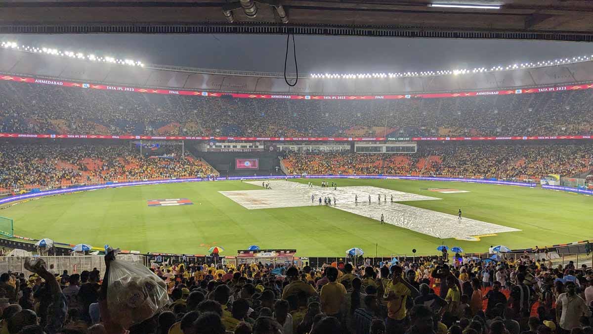 మోదీ స్టేడియంలోని వర్షానికి సంబంధించిన కీలక అప్డేట్ను ప్రముఖ కామెంటేటర్ హర్షా భోగ్లే ట్విటర్ వేదికగా పంచుకున్నారు. 'ప్రస్తుతం భారీ వర్షం పడుతోంది. ఉరుములతో కూడిన వర్షం కారణంగా మైదానంలో నీళ్లు నిలిచాయి. మరికొద్ది క్షణాల్లో వర్షం ఆగిపోతుందని వాతావరణ శాఖ పేర్కొంది.