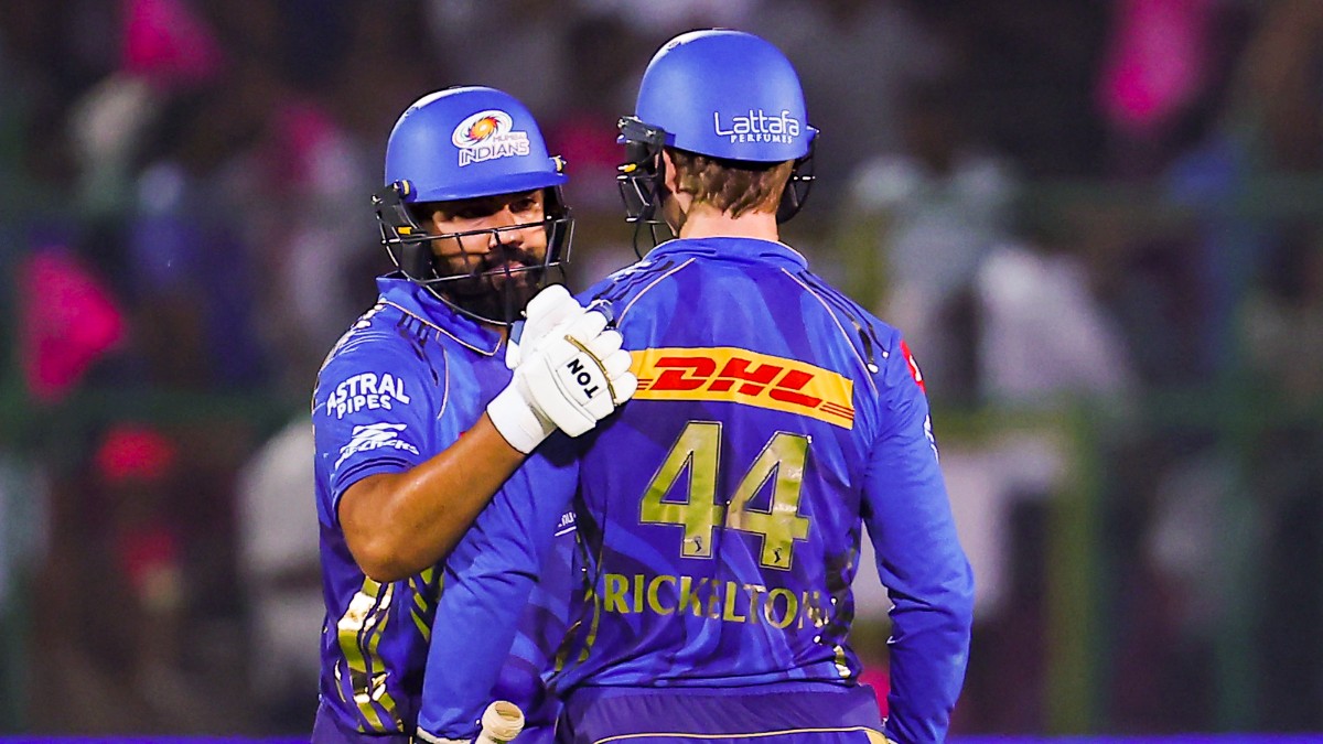ఓపెనర్లు ర్యాన్ రికెల్టన్(38 బంతుల్లో 7 ఫోర్లు, 3 సిక్స్లతో 61), రోహిత్ శర్మ(36 బంతుల్లో 9 ఫోర్లతో 53) హాఫ్ సెంచరీలతో రాణించారు. సూర్యకుమార్ యాదవ్(23 బంతుల్లో 4 ఫోర్లు, 3 సిక్స్లతో 48 నాటౌట్), హార్దిక్ పాండ్యా(23 బంతుల్లో 6 ఫోర్లు, సిక్స్తో 48 నాటౌట్) మెరుపులు మెరిపించారు. రాజస్థాన్ రాయల్స్ బౌలర్లలో మహీష్ తీక్షణ, రియాన్ పరాగ్ చెరో వికెట్ తీసారు.