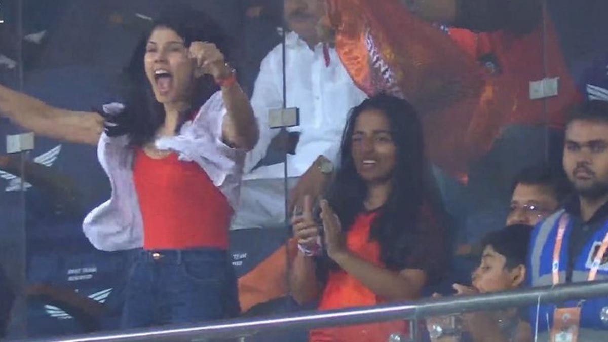 ఫామ్లో ఉన్న కైల్ మేయర్స్ ఇలా అవుటవడంతో సన్రైజర్స్ హైదరాబాద్ అభిమానులు సంతోషించారు. ఈ సమయంలో సన్రైజర్స్ యజమాని కావ్య మారన్ కూడా సంతోషంతో ఎగిరి గంతులు వేసింది. ఇది చూసిన అభిమానులు మరింత సంతోషించారు. పడింది ఒక్క వికెటే అయినా కావ్య సంతోషం తమలో కూడా ఆనందం నింపిందని ఫ్యాన్స్ అంటున్నారు. కావ్య ఇలా సెలబ్రేట్ చేస్తున్న వీడియో, ఫొటోలు సోషల్ మీడియాలో తెగ వైరల్ అవుతున్నాయి.
