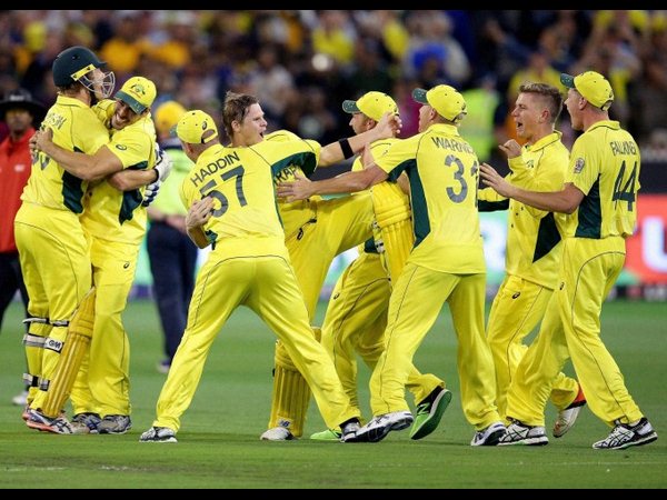 ఐసీసీ ప్రపంచ కప్ ఫైనల్లో న్యూజిలాండ్ పైన ఆస్ట్రేలియా 7 వికెట్ల తేడాతో గెలిచింది. కివీస్ వికెట్ తీసిన జేమ్స్ ఫాల్కనర్ను అభినందిస్తున్న సహచరులు.
