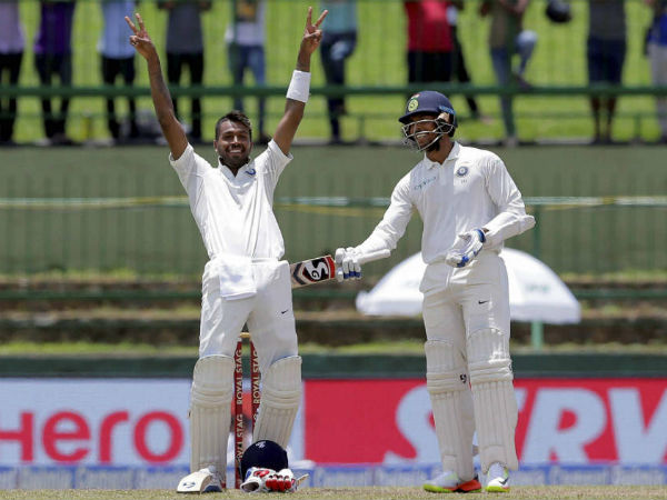 కాగా, ఒకవైపు వికెట్లు పడుతున్నా స్పిన్నర్ పుష్పకుమార బౌలింగ్లో వరుసగా 4, 4, 6, 6, 6 బాది పాండ్యా ఔరా అనిపించాడు. తద్వారా ఒకే ఓవర్ లో 26 పరుగుల్ని పిండుకుని తన ఖాతాలో ఓ రికార్డుని వేసుకున్నాడు. టెస్టు ఫార్మాట్లో ఒక ఓవర్లో అత్యధిక పరుగుల్ని సాధించిన భారత క్రికెటర్గా గుర్తింపు సాధించాడు.