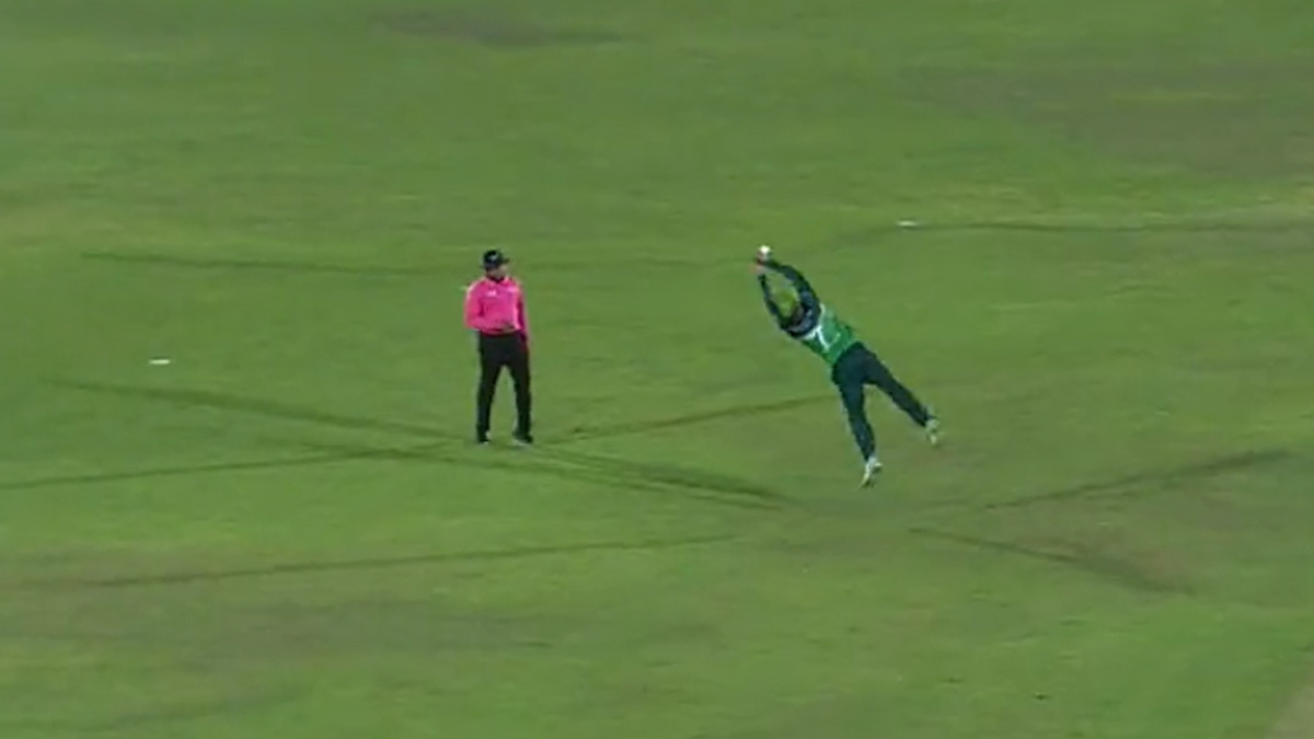 జిమ్నాస్టిక్ స్టంట్ను తలపించిన ఈ క్యాచ్ను చూసి నెటిజన్లు ఫిదా అవుతున్నారు. ప్రస్తుతం ఈ క్యాచ్కు సంబంధించిన వీడియో నెట్టింట వైరల్గా మారింది. షాదాబ్ ఖాన్పై సర్వత్రా ప్రశంసల జల్లు కురుస్తోంది. ఇంత గొప్ప క్యాచ్ పట్టింది పాకిస్థాన్ ఆటగాడేనా? అని కొందరు నెటిజన్లు సందేహం వ్యక్తం చేస్తున్నారు.