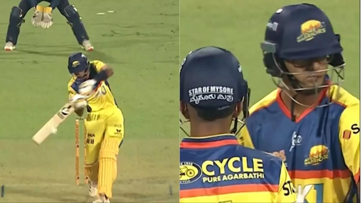 వర్షం అంతరాయం కలిగించిన ఈ మ్యాచ్లో మైసూర్ వారియర్స్ ముందుగా బ్యాటింగ్ చేసి నిర్ణీత 18 ఓవర్లలో 6 వికెట్లకు 182 పరుగులు చేసింది. ఎస్యూ కార్తీక్, సీఏ కార్తీక్ నిలకడగా ఆడారు. ఎస్యూ కార్తీక్ ఔటైన అనంతరం క్రీజులోకి వచ్చిన సమిత్ ద్రవిడ్.. జ్ఞానేశ్వర్ నవీన్ వేసిన ఏడో ఓవర్లో భారీ సిక్సర్ కొట్టాడు. ఈ ఓవర్ నాలుగో బంతిని నవీన్.. ఔట్ సైడ్ ఆఫ్ స్టంప్ దిశగా షార్ట్ పిచ్ బాల్గా వేయగా.. సమిత్ లెగ్ సైడ్ అద్భుతంగా సిక్సర్ తరలించాడు. ఈ సిక్సర్కు అభిమానులతో పాటు ఆటగాళ్లు అవాక్కయ్యారు. కానీ ఆ మరుసటి బంతికే సమిత్ ఔటయ్యాడు. మొత్తం ఏడు బంతుల్లో ఏడు పరుగులే చేశాడు.