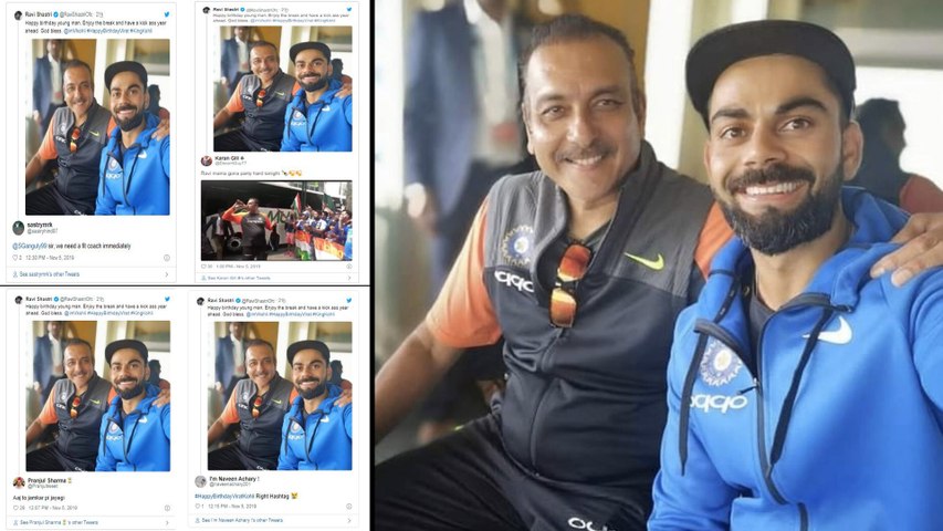 ఈ సందర్భంగా కోహ్లీతో కలిసి ఉన్న ఫోటోను రవిశాస్త్రి తన ట్విట్టర్లో పోస్టు చేస్తూ "హ్యాప్ బర్త్డే యంగ్మ్యాన్. బ్రేక్ను ఎంజాయ్ చేయి. రాబోయే రోజుల్లో అద్భుతంగా ఆడాలి. దేవుడు ఆశీర్వదించుగాక. #HappyBirthdayVirat #KingKohli" అంటూ ట్వీట్ చేశాడు.