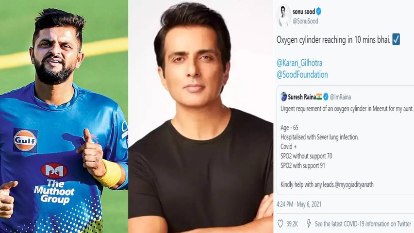 కరోనా సంక్షోభ సమయంలో ఎంతో మందికి సాయం చేసిన సోనూ సూద్.. తాజాగా టీమిండియా మాజీ క్రికెటర్, మిస్టర్ ఐపీఎల్ సురేశ్ రైనాకు సాయం చేసి మరోసారి పెద్ద మనసు చాటుకున్నారు. కేవలం 10 నిమిషాల్లోనే ఆక్సిజన్ సిలిండర్ను పంపి తనలోని మానవత్వాన్ని చూపారు. 'మీరట్లో ఉన్న మా ఆంటీ కోసం అత్యవసరంగా ఆక్సిజన్ సిలిండర్ కావాలి. ఆమె వయసు 65. తీవ్ర ఊపిరితిత్తుల ఇన్ఫెక్షన్తో హాస్పిటల్లో ఉన్నారు' అని రైనా ట్వీట్ చేశాడు. మిస్టర్ ఐపీఎల్ ట్వీట్కు స్పందించిన సోనూ సూద్..'10 నిమిషాల్లోనే ఆక్సిజన్ సిలిండర్ అక్కడికి చేరుకుంటుంది భాయ్' అంటూ రిప్లై ఇచ్చారు.