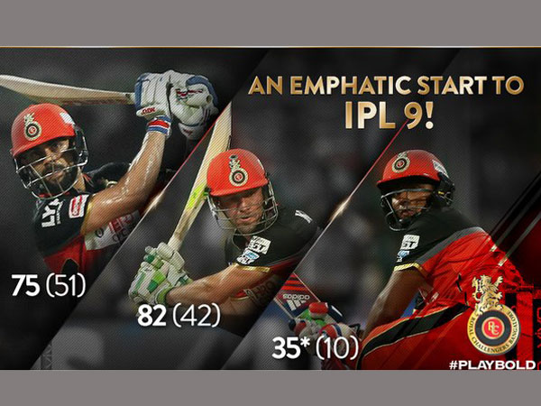 తొమ్మిదో ఇండియన్ ప్రీమియర్ లీగ్ (ఐపిఎల్)లో రాయల్ చాలెంజర్స్ బెంగళూరు శుభారంభం చేసింది. సన్రైజర్స్ హైదరాబాద్తో మంగళవారం జరిగిన మ్యాచ్ని 45 పరుగుల తేడాతో గెల్చుకుంది. ఎబి డివిలియర్స్ కేవలం 42 బంతుల్లోనే 82 పరుగులు చేసి బెంగళూరు భారీ స్కోరు సాధించడంలో కీలక పాత్ర పోషించాడు.