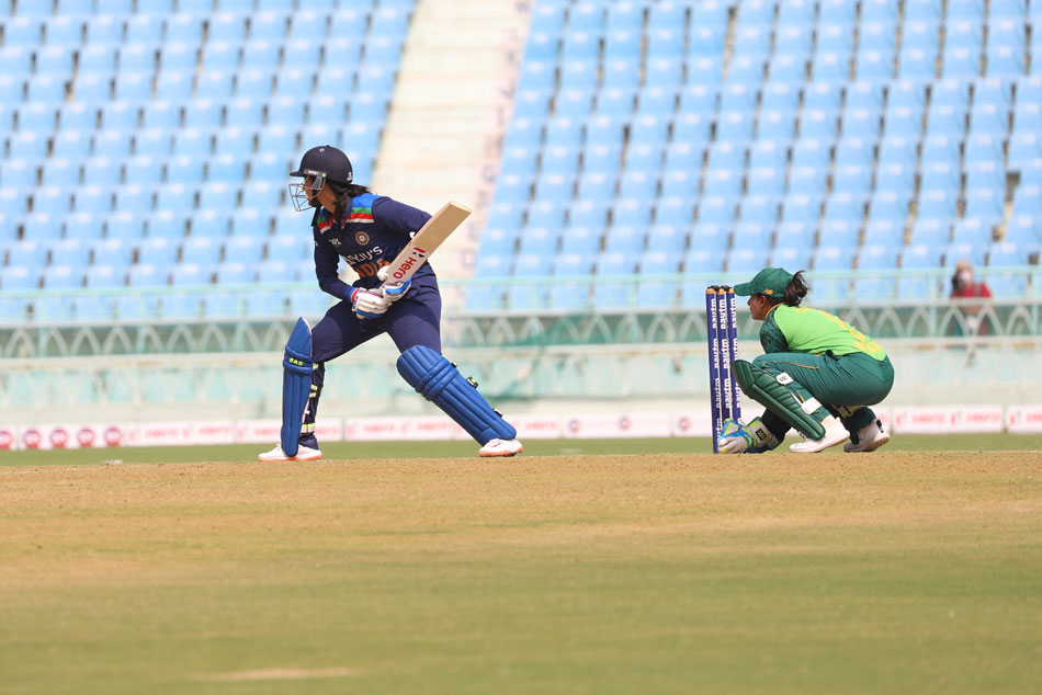 అనంతరం స్వల్ప లక్ష్య ఛేదనలో ఓపెనర్ స్మృతి మంధాన (80 నాటౌట్; 64 బంతుల్లో 10×4, 3×6) అద్భుత హాఫ్ సెంచరీతో అదరగొట్టింది. పూనమ్ రౌత్ (62 నాటౌట్; 89 బంతుల్లో 8×4) కీలక ఇన్నింగ్స్ ఆడటంతో భారత్ 28.4 ఓవర్లలోనే వికెట్ మాత్రమే కోల్పోయి లక్ష్యాన్ని ఛేదించింది. ఓపెనర్ జెమిమా రోడ్రిగ్స్ (9) త్వరగానే పెవిలియన్ చేరినా.. మంధాన, పూనమ్ మరో వికెట్ పడకుండా ఆడుతూ సునాయాస విజయాన్ని కట్టబెట్టారు. ఇద్దరూ ఆడుతూ పాడుతూ లక్ష్యాన్ని ఛేదించారు. ప్రొటీస్ పేసర్ షబ్నిమ్ ఇస్మాయిల్ ఒక వికెట్ తీసింది.