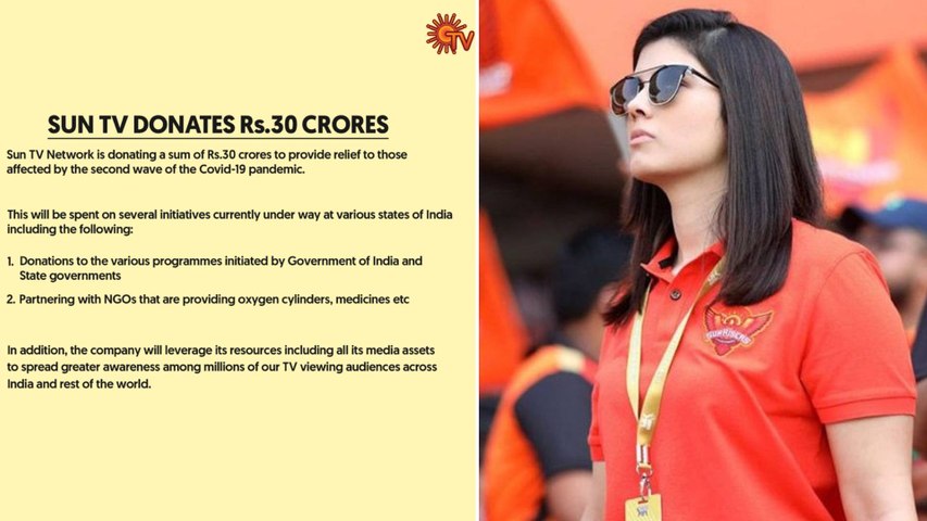 'కరోనా సెకండ్వేవ్ కారణంగా ప్రభావితమైన బాధితులకు అండగా ఉండేందుకు సన్ టీవీ నెట్వర్క్ రూ. 30 కోట్లను విరాళంగా ఇస్తోంది. కేంద్ర, రాష్ట్ర ప్రభుత్వాలు చేపడతున్న వివిధ కార్యక్రమాలకు ఈ నిధులను ఉపయోగించనున్నాం. ఆక్సీజన్ సిలిండర్లు, మెడిసిన్ సరఫరా నిమిత్తం ఎన్జీఓలతో భాగస్వామ్యమై ముందుకు సాగుతాం.