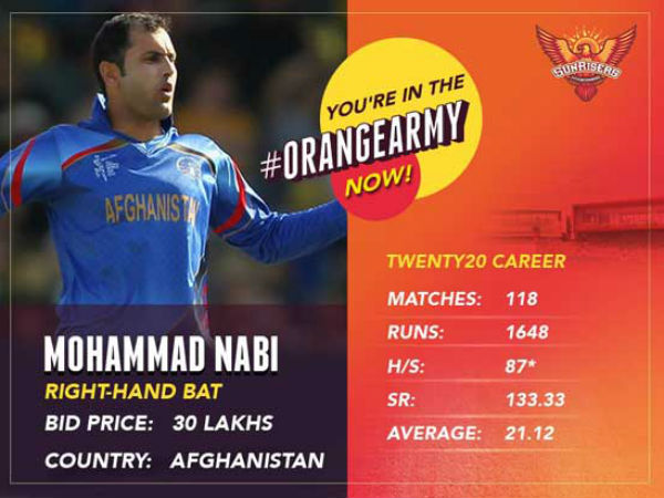 హైదరాబాద్: ఐపీఎల్ 10వ ఎడిషన్ కోసం సోమవారం (ఫిబ్రవరి 20) బెంగుళూరులో నిర్వహించిన వేలంలో సన్ రైజర్స్ హైదరాబాద్ ప్రాంఛైజీ తనను కోనుగోలు చేయడం పట్ల ఆప్ఘనిస్థాన్కు చెందిన మహ్మద్ నబీ సంతోషం వ్యక్తం చేశాడు. ఐపీఎల్లో అసోసియేట్ దేశంగా ఉన్న ఆప్ఘనిస్థాన్కు చెందిన ఐదుగురు కొత్త ఆటగాళ్లు వేలంలో పాల్గొన్నారు.