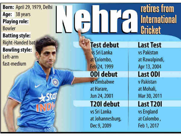 టెస్టులకు 2004లో, వన్డేలకు 2011 వరల్డ్ కప్ తర్వాత, 2014లో ఫస్ట్క్లాస్ క్రికెట్ నుంచి రిటైరైన నెహ్రా టీ20ల్లో మాత్రం కొనసాగుతూనే ఉన్నాడు. భారత్ తరుపున 26 టీ20లు ఆడి 34వికెట్లు తీశాడు. ఈ ఏడాది మొదట్లో ఇంగ్లాండ్తో జరిగిన టీ20లో 3/19 అత్యుత్తమ ప్రదర్శన నమోదు చేశాడు.