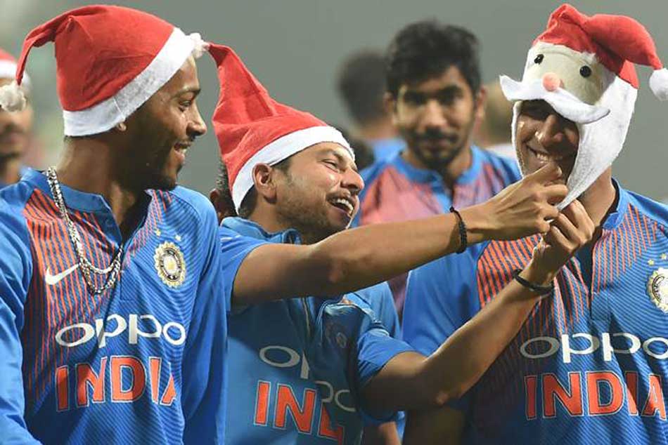 ఈ సమయంలో కుల్దీప్ యాదవ్ అయితే ఆ టోపీకి ఉన్న గెడ్డంతో ధోనిని ఆటపట్టించడం విశేషం. అనంతరం హార్దిక్ పాండ్యా, కుల్దీప్ యాదవ్ అయితే సెల్ఫీలు దిగేందుకు పోటీపడ్డారు. ధోని శాంటా క్లాజ్ ధరించిన ఫోటోలు ఇప్పుడు సోషల్ మీడియాలో వైరల్గా మారాయి.