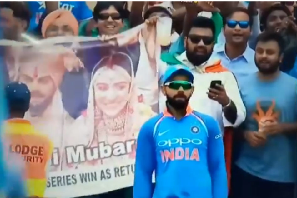 టాస్ గెలిచి భారత్ తొలుత ఫీల్డింగ్ ఎంచుకుంది. మ్యాచ్ మధ్యలో కెప్టెన్ కోహ్లీ బౌండరీ లైన్ వద్ద ఫీల్డింగ్కు వెళ్లాడు. ఆ సమయంలో సమీపంలో ఉన్న అభిమానులు కోహ్లీ-అనుష్కల పెళ్లికి సంబంధించిన బ్యానర్తో కనిపించారు. శుభాకాంక్షలు తెలిపారు. అక్కడే ఉన్న కోహ్లీ వారికి ధన్యవాదాలు తెలిపాడు. ఈ వీడియో సామాజిక మాధ్యమాల్లో చక్కర్లు కొడుతూ నెటిజన్లను విపరీతంగా ఆకట్టుకుంటోంది.