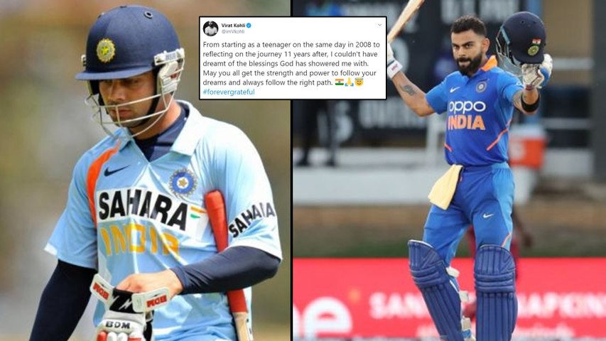 కోహ్లీ మొదటి మ్యాచ్ అభిమానుకు ఎప్పటికీ గుర్తుండిపోతుంది. అప్పటి నుంచి అంచెలంచెలుగా ఎదిగి ప్రస్తుతం మూడు ఫార్మాట్లలో భారత క్రికెట్ జట్టుకు కెప్టెన్గా కొనసాగుతున్నాడు. ఈ నేపథ్యంలో తన ట్విట్టర్లో "2008లో యువకుడిగా భారత జట్టులో అడుగుపెట్టిన తాను.. 11 ఏళ్ల ప్రయాణంలో ఇంత సాధిస్తానని కలలో కూడా ఊహించలేదు. దేవుడి ఆశీస్సుల వల్లే ఈ స్థాయికి చేరుకోగలిగా. సరైన మార్గంలో తమ కలలను సాకారం చేసుకోవాలని, అందుకు కావాల్సిన శక్తి సామర్థ్యాలను సొంతం చేసుకోవాలి. ఈ సుదీర్ఘ ప్రయాణంలో తనకు సహకారం అందించిన ప్రతి ఒక్కరికీ రుణపడి ఉంటా" అని కోహ్లీ ట్వీట్ చేశాడు.