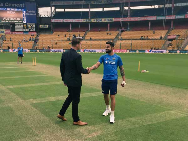 దీనికి సంబంధించిన వీడియోను బీసీసీఐ తన అధికారిక ట్విటర్లో పోస్టు చేసింది. అంతక ముందు కోహ్లీ ఆసీస్ మాజీ పేసర్ బ్రెట్ లీతో కరచాలనం చేశాడు. ఇదిలా ఉంటే బెంగుళూరు టెస్టులో ఆస్ట్రేలియా తన తొలి ఇన్నింగ్స్లో 276 పరుగులకు ఆలౌటైంది.