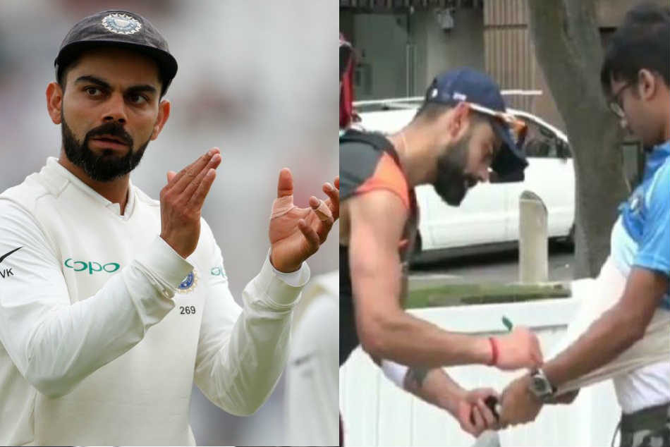 అతను అడిగాడని కోహ్లీ ఛాతిపై సంతకం చేశాడు. ఆ అభిమాని అక్కడితో ఆగకుండా టీ షర్ట్ లోపల కూడా చేయమన్నాడు. కోహ్లీ కాస్త ఇబ్బందిగా భావించి పేపర్పై ఆటోగ్రాఫ్ ఇచ్చాడు. ఆ తర్వాత మళ్లీ అతను టీ షర్ట్ లోపల కూడా సంతకం చేయమని అడగడంతో.. దానిపై కూడా ఆటోగ్రాఫ్ ఇచ్చాడు. ఆ తర్వాత అతనితో పాటు వచ్చిన మరొకరితో ఫొటోకు ఫోజిచ్చాడు.
