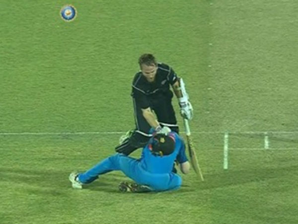 ఈ క్రమంలో అక్షర్ పటేల్ వేసిన ఇన్నింగ్స్ 28వ ఓవర్లోని 3వ బంతిని ఎదుర్కొన్న న్యూజిలాండ్ కెప్టెన్ కేన్ విలియమ్సన్ పరుగు తీస్తున్న క్రమంలో బంతిని సమీపంలో ఉన్న పాండ్యా అందుకున్నాడు. బంతిని నేరుగా వికెట్లవైపు విసిరే క్రమంలో పాండ్యా పల్టీలు కొట్టాడు. అదే సమయంలో పరుగు తీస్తున్న విలియమ్సన్.. పాండ్యాను ఢీకొట్టాడు.