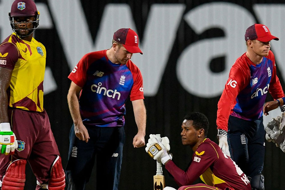 అనంతరం లక్ష్యచేధనకు దిగిన వెస్టిండీస్ నిర్ణీత 20 ఓవర్లలో 8 వికెట్లు కోల్పోయి 170 పరుగులు మాత్రమే సాధించింది. విండీస్ జట్టులో రొమారియో షెపర్డ్(28 బంతుల్లో ఫోర్, 5 సిక్సర్లతో 44 నాటౌట్), అకేల్ హోస్సేన్(16 బంతుల్లో 3 ఫోర్లు, 4 సిక్స్లతో 44 నాటౌట్) పరుగులతో టాప్ స్కోరర్లగా నిలిచారు. ఇంగ్లండ్ బౌలర్లలో మోయిన్ అలీ మూడు వికెట్లు పడగొట్టగా,ఆదిల్ రషీద్ రెండు వికెట్లు సాధించాడు. ఆల్రౌండ్ ప్రదర్శన కనబర్చిన మొయిన్ అలీకి మ్యాన్ ఆఫ్ ది మ్యాచ్ దక్కింది.